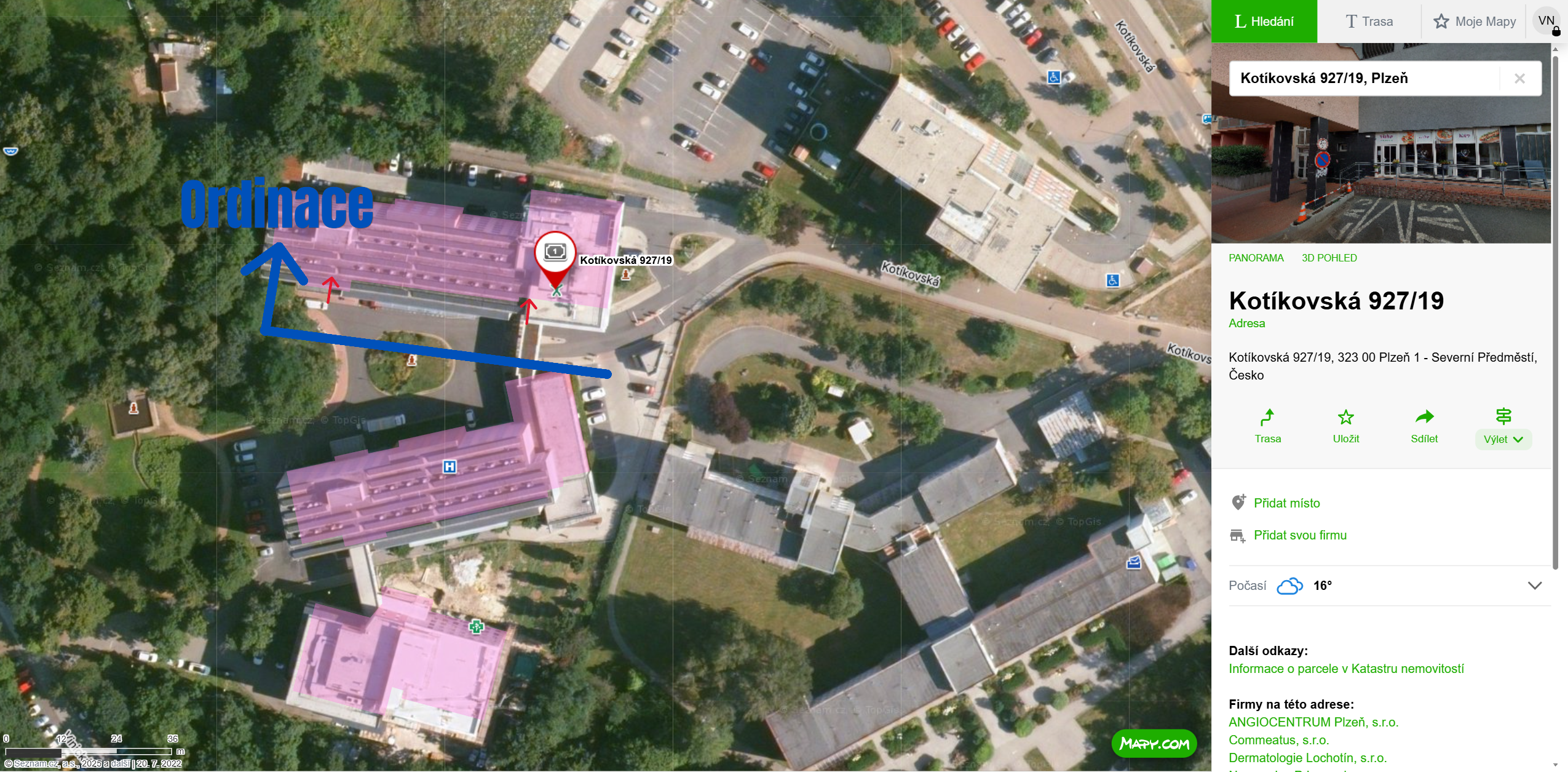 dovoluji si Vám oznámit, že v nejbližší době dojde k přesunu ordinace do nových prostor v areálu nemocnice Privamed na adresu Kotíkovská 927/19, Plzeň. Ordinace bude umístěna v přízemí hlavní budovy centra následné péče (pravá budova), samostatný vchod za rohem od vchodu do budovy.